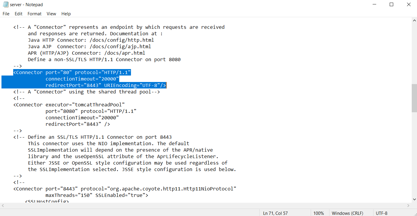 3. "apache-tomcat-9.0.71" ํด๋ ์, "conf" ํด๋์ ์๋ server.xml์์ ํฌํธ๋ฒํธ๋ฅผ ํ์ค ํฌํธ๋ฒํธ์ธ 80์ผ๋ก ์์ ํด์ค๋ค.